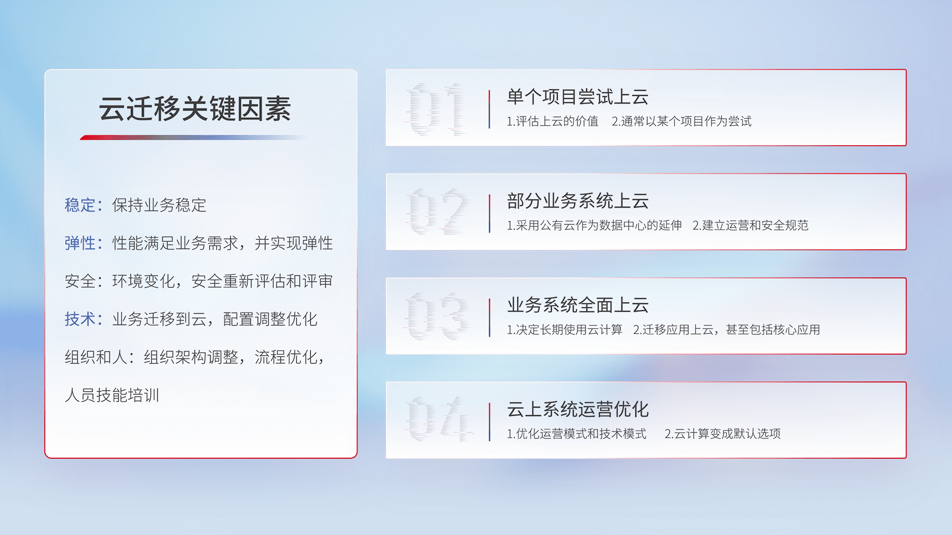 结合实际业务,,,从规划设计、、云平台选型、、云原生改造、、、数据迁移、、、集成交付,,迁移全过程为客户识别最佳上云路径,,,,做好风险识别管理,,,,设计网络架构、、身份权限、、、安全审计合规、、、操作审计、、、日志审计、、监控告警策略、、多站点容灾设计等,,对云上基础设施进行整体规划,,提升IT治理水平,,以满足弹性、、、高可用、、、高性能的需求。。。
