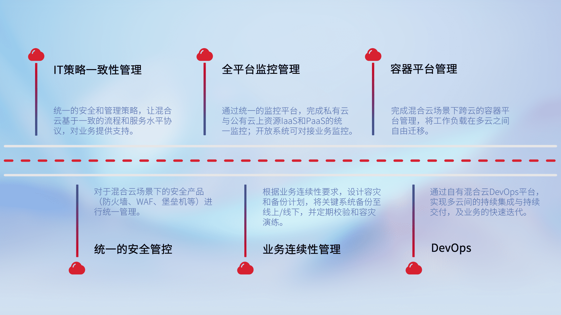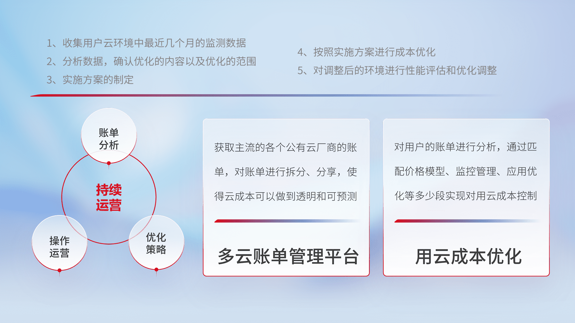 通过多云纳管,,,,以统一的资源数据模型把客户的云资源进行抽象和封装,,,,进而实现对多云资源的统一操作,,,保障云资源管理的可靠性、、稳定性与可用性。。。量身定制化运维内容,,配置、、、开发运维、、、、补丁管理、、、备份、、、监控、、、认证和访问管理、、审计和日常巡检等,,,保障在用云过程中的可靠度,,,稳定度以及高可用率。。