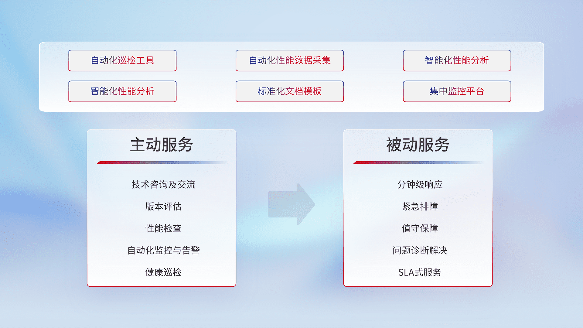 智能化工具和标准化文档,,,,保障服务质量,,提供主动服务(包含技术咨询、、版本评估、、、性能检查、、、自动化监控与告警、、健康巡检)和被动服务包含(分钟级响应、、、紧急排障、、、值守保障、、、、问题诊断解决、、、SLA服务)。。